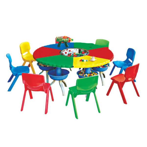 Seating Arrangement: Surrounded by eight matching chairs in different colors, promoting social interaction and group activities among children.