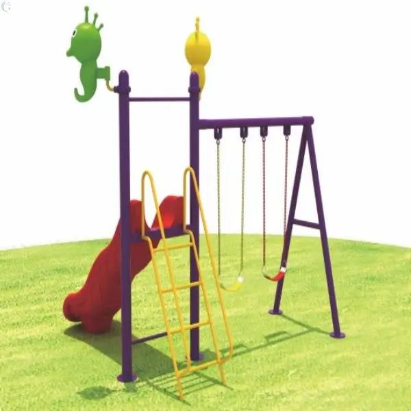 - Swings: On the right side, there are three swings attached to a purple frame. The swings have chains and colorful seats, including a yellow one.